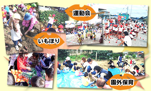 ポケットの中にどんぐりをいっぱいつめながら散歩を楽しむ子ども達、秋になるとどんぐりや色づいた落ち葉などを拾い集める姿が見られます。